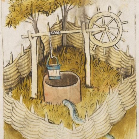 Wenn der Brunnen direkt auf einer Quelle gebaut werden konnte, wurde die Wasserqualität deutlich erhöht. Wie hier auf einer Buchmalerei aus dem 14ten Jahrhundert. Der Brunnen wurde mit einem Zaun geschützt, und das überschüssige Quellwasser konnte über einen Ablauf abfließen.