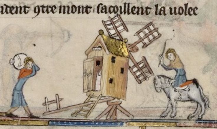 Ein Bild aus einer Buchmalerei aus dem späten 15ten Jahrhundert aus Flandern, zeigt eine Wassermühle. Man erkennt gut, dass die Mühle einen eigenen Hof darstellt, welcher nicht direkt in das Dorf eingebunden wurde.