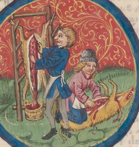 Was auf den beiden deutschen Buchmalereien aus der Mitte des 15jhd. zu sehen ist, sind keine Wildschweine. So sahen die ganz normalen, in Masse gehaltenen Schweine aus, was heute unsere bekannten Rosa Schweine wären. Zusätzlich dazu, anders als heute, war Schweinefleisch im Spätmittelalter eher teures Fleisch im Gegensatz zu Rind.