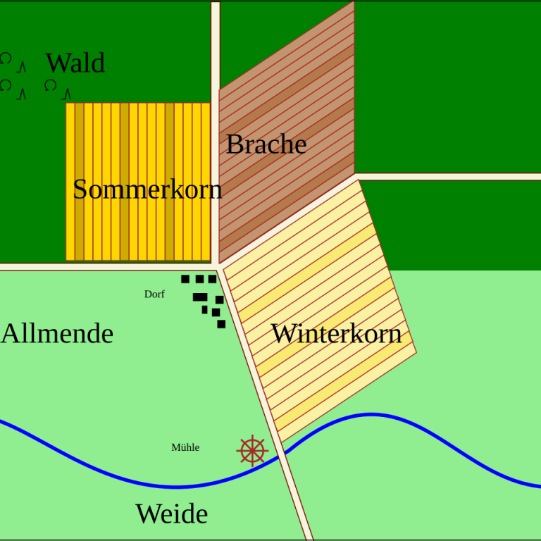 Durch das Einbringen einer Fruchtfolge auf den Ackerflächen und vor allem durch eine der wichtigsten Erkenntnisse/Entdeckungen des Mittelalters, der Dreifelderwirtschaft, konnten kontinuierlich die Ackerflächen bewirtschaftet werden.