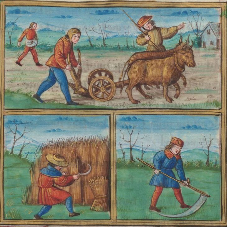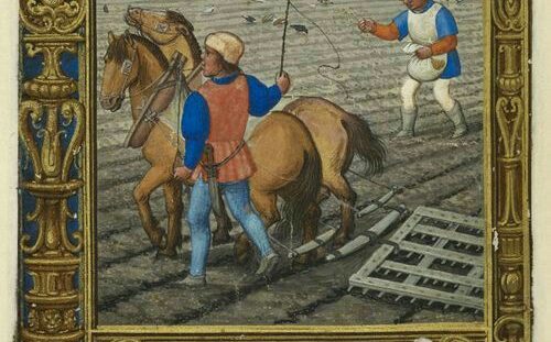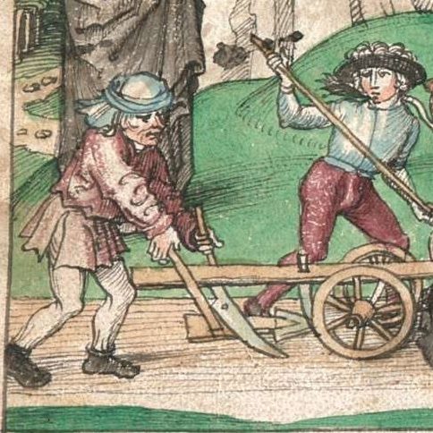 Das Bestellen des Ackers, zur Zeit um 1450 erfolgte mit einem modernen Wendepflug, welcher auf einem beräderten Fuhrwerk montiert war. Damit war ein gleichmäßiges Umlegen des Ackerbodens möglich, und durch die Räder, zog sich das Pflugeisen nicht unkontrollierbar in den Erdboden.
