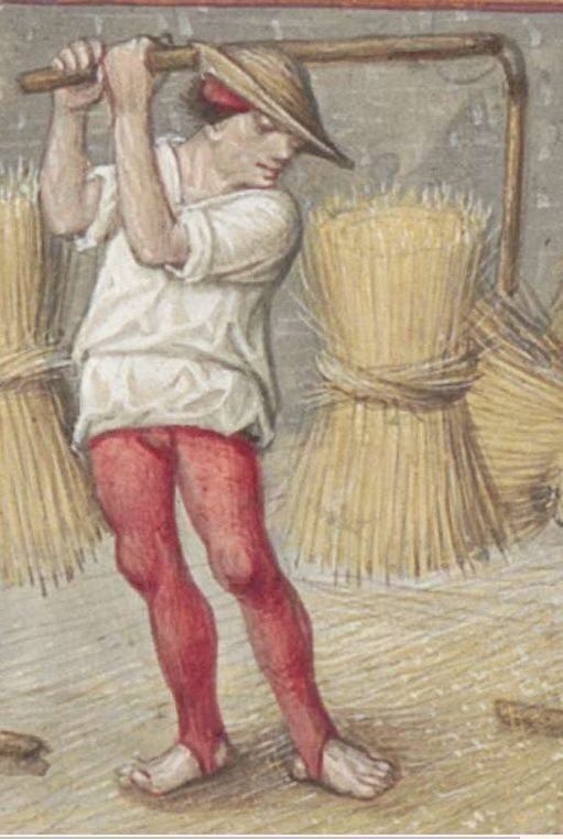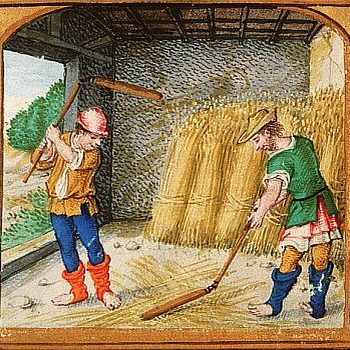 Mit Dreschflegeln wurden die Getreidekörner aus den Ähren raus geschlagen, wie hier in Buchmalereien aus dem 14ten bis zum 16ten Jahrhundert zu sehen.