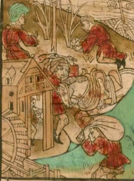 Auf den Auszügen zweier Buchmalereien, die obere eine aus dem Rheinland, ca. 1460 und die untere aus den Niederlanden, frühes 16te Jhd, wird das ganze sehr schön gezeigt.