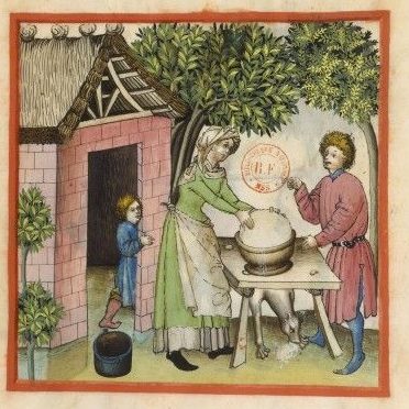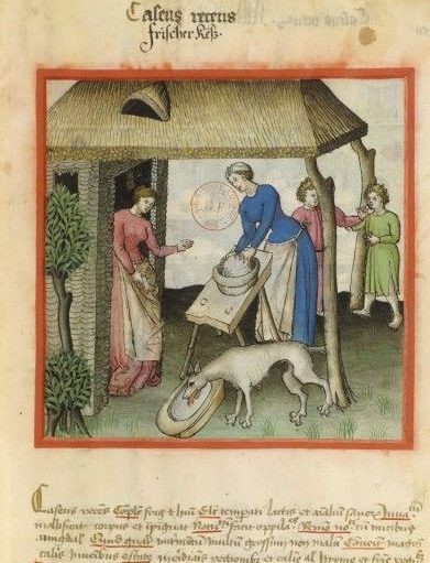 In den Beiden Buchmalereien aus dem Rheinland, um 1450, sieht man oben die Herstellung von Ziegen/Schafskäse, und unten eine Verkaufsabwicklung über eine Buttermenge.