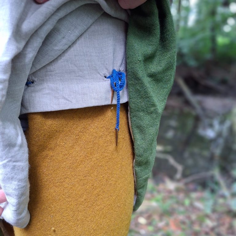 Als Unterkleidung wurden Leibhemdchen und Unterhosen genutzt, ebenfalls aus Leinen. Zusätzlich über dem Leibhemdchen, trage ich eine Weste aus festem Leinen mit frontal verschnürrten V-Ausschnitt, an welchem die Hosen angenestelt werden. Nesteln?