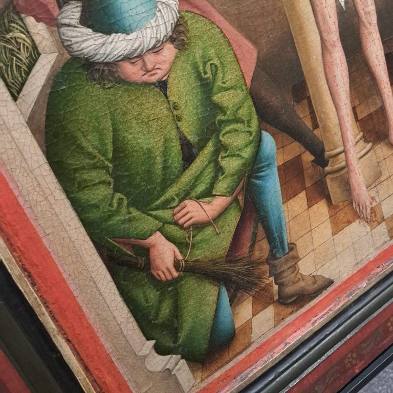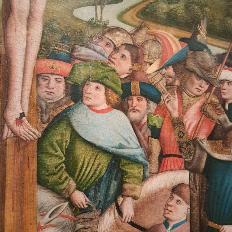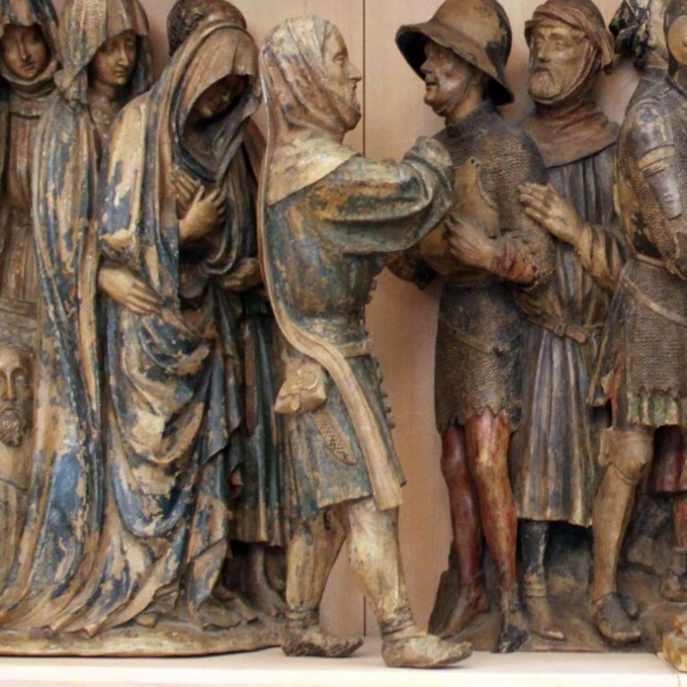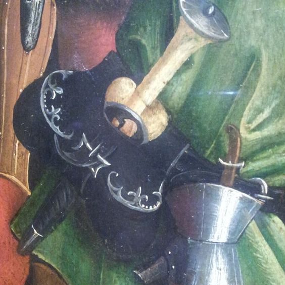 Auf dem Billerbecker Altar erkennt man aber nochmal schön die saftige Farbe und die auffällige zweier Knöpfung, welche typisch für die Zeit um 1450 und fortlaufend war.