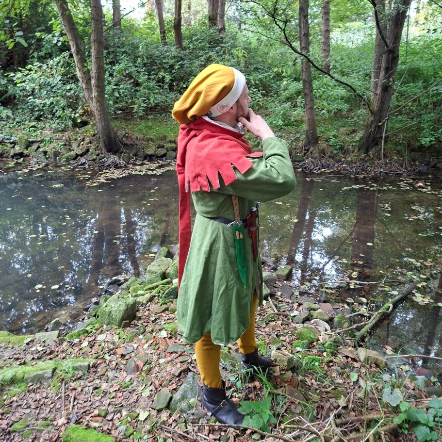 Von Wegen! Wir schauen uns hier die Kleidung an, welche man zu der Zeit um 1450 bei uns hier auf den Dörfern lebenden, gut bestellten Handwerker erwarten kann. Die Kleidung ist von Quellen aus dem Rheinland, natürlich Westfalen und dazu nördlicheren Regionen inspiriert. Exakt für das Münsterland, oder besser noch Rosendahl, einen Quellenstamm aufzubauen, ist leider nicht möglich.
