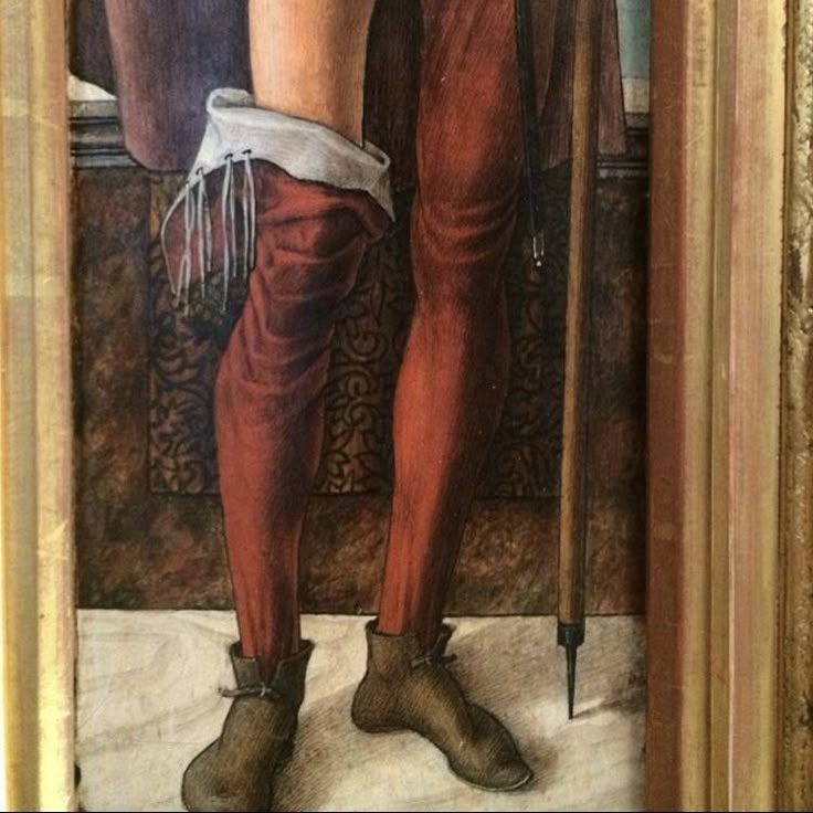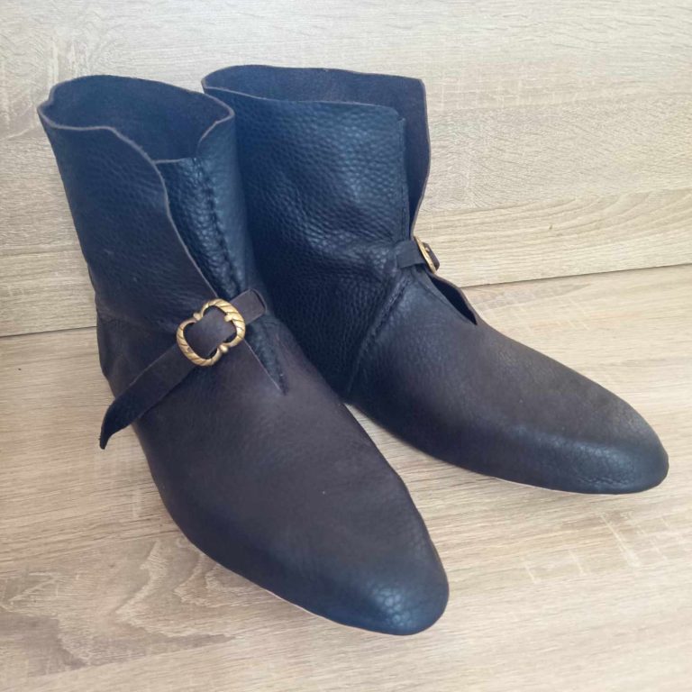 Die Form der Schuhe, mit ihrem Schlitz vom Spann hoch zum Knöchel, welcher manchmal mit nur einem Riemen und Schnalle geschlossen wird, findet sich quer durch das Reich. Sogar bei uns Regional, wie auf den erhaltenen Altären in Schöppingen oder dem Billerbecker Altar zu sehen. Die Schuhe durften gerne, je nach Gesellschaftlichen Stand, vorne teilweise sehr Spitz und lang zulaufen. Für den Dörflichen Handwerker, habe ich darauf verzichtet.