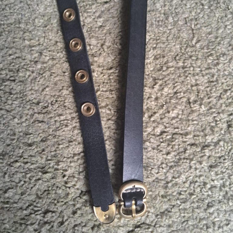 Ich habe mich für diese sehr typische Doppelschnallenform entschieden, zusammen mit in Messinghülsen gefassten Gürtellöchern. Dazu eine schlichte Gürtelzunge, welche das Ende des Gürtels sauber abschließt.