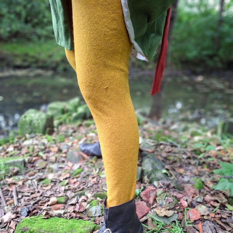 Inspiration für die Hosen habe ich mir durch viele Buchmalereien geholt, welche Arbeitende Menschen zeigen. Ich habe mich für separate Beinlinge mit angesetzten Füßling entschieden. Egal bei welche Tätigkeit auf dem Dorf, war der Anblick herunter gerollter Beinlinge fast schon der Standard. Beim häufigen Bücken stören Beinlinge nicht so arg wie die genestelten Hosen und durch das fixe herunterrollen sind auch hohe Temperaturen besser erträglich. Meine Beinlinge schließen bis hoch zum Wams und lassen nur den Schritt frei. Würde man zu der Zeit modisch absolut vorne mit dabei sein wollen, würde man natürlich zu der geschlossenen Hose wechseln.