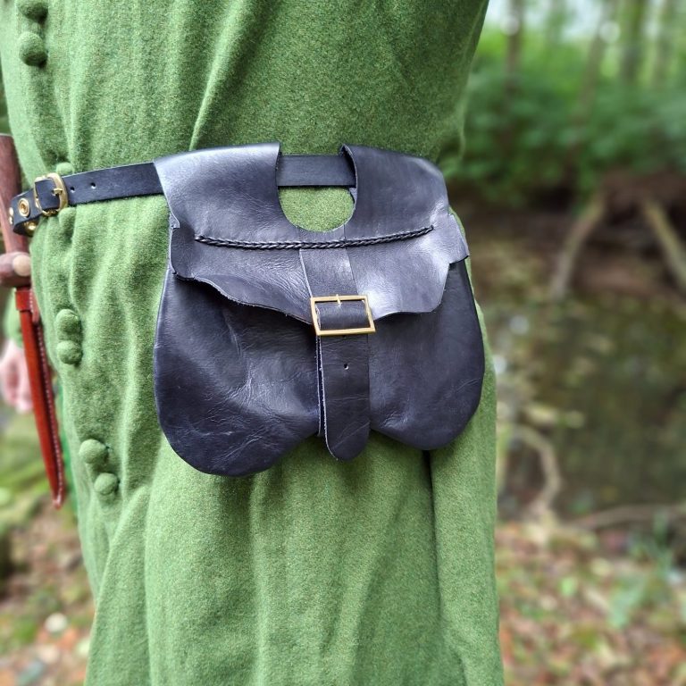 Diese taschenform ist seit dem 14ten Jahrhundert gebräuchlich. Sie wird mit einer Schnalle und einem Riemen geschlossen, welcher zusätzlich die kleine Abdeckung in Position hält.